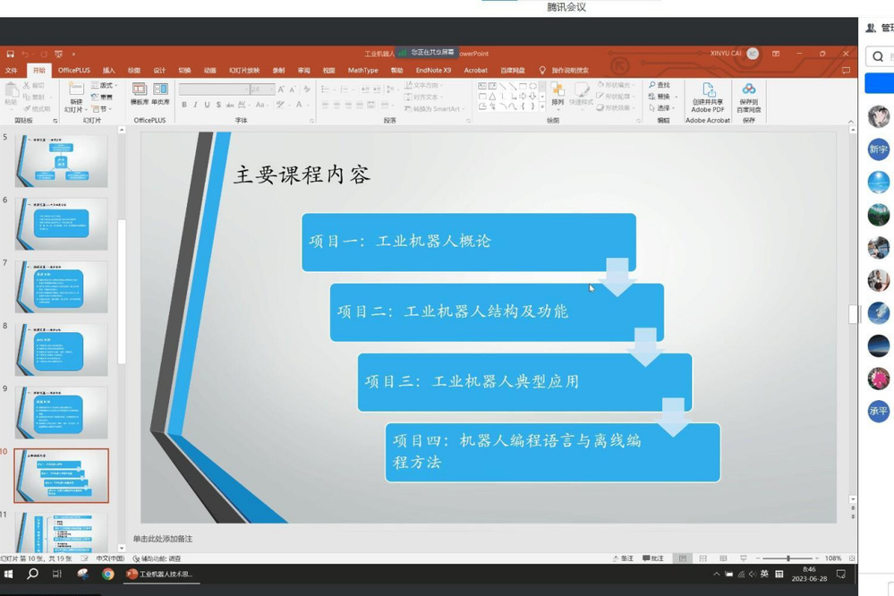 为贯彻落实《高等学校课程思政建设指导纲要》(教高〔2020〕3号)、《米兰官方网页版“课程思政”建设实施方案(2021年-2023年)》(南机电院委〔2021〕24号)等文件精神,全面推进课程思政教学改革创新,深入挖掘课程思政内涵,强化课程育人导向,挖掘和丰富课程育人内涵,充分发挥课堂教学育人主渠道作用,6月28日上午8点45分,机电一体化教研室在线上组织开展2023年课程思政说课达标赛初赛。本次活动由朱红娟老师主持,机电教研室全体教师出席。