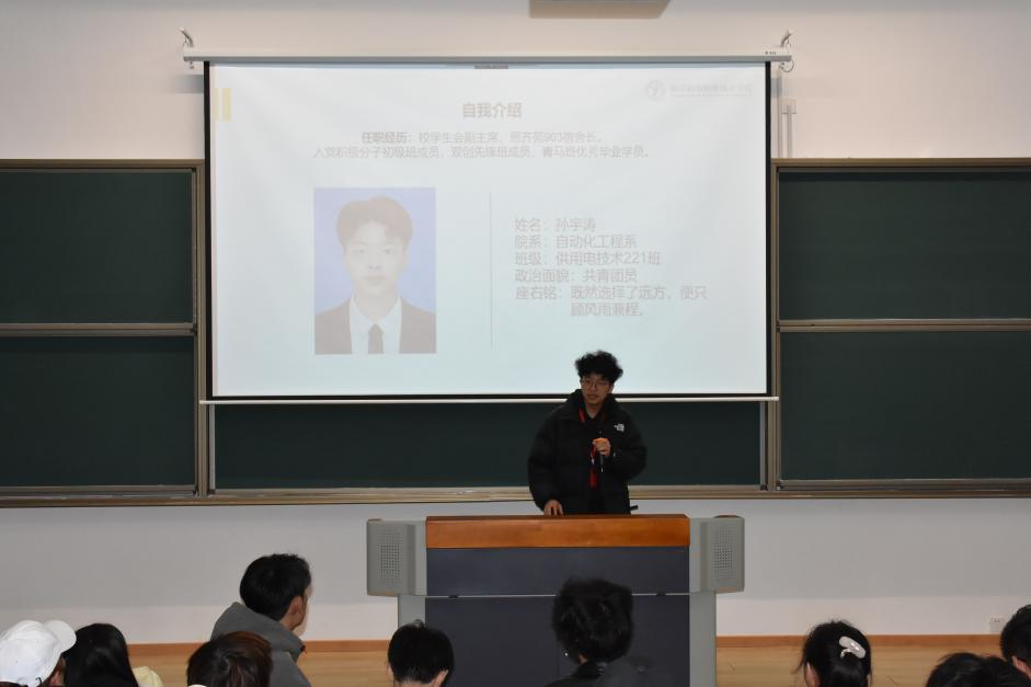 11月23日,自动化工程系举办了第十期故事分享会。本次故事分享会由校学生会副主席孙宇涛进行分享,学生会全体成员及班长参加。