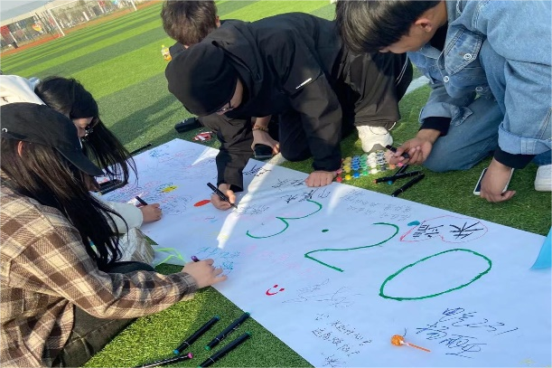此外,活动还设置了风筝绘画与放飞环节。同学们在操场上绘画属于自己的风筝。风筝在蓝天白云间翱翔,象征着同学们在青春的道路上勇往直前,追求梦想。最后,同学们合影留念。
