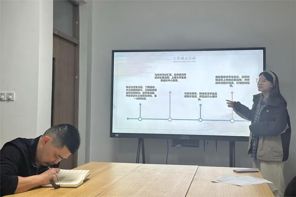 贾涵对学生突发危机事件做了详细阐释,并对危机事件易发领域详细列举。她强调,学生突发危机事件具有突发性、不确定性、危害性等特点,辅导员应当从思想上高度重视,在班级中建立好紧急情况干预制度,尽可能预防危机事件的发生,并提高自身处理危机能力。她用实际的案例,分享了自己处理突发事件的经验。各个辅导员对案例提出自己的想法,进行热烈的讨论。