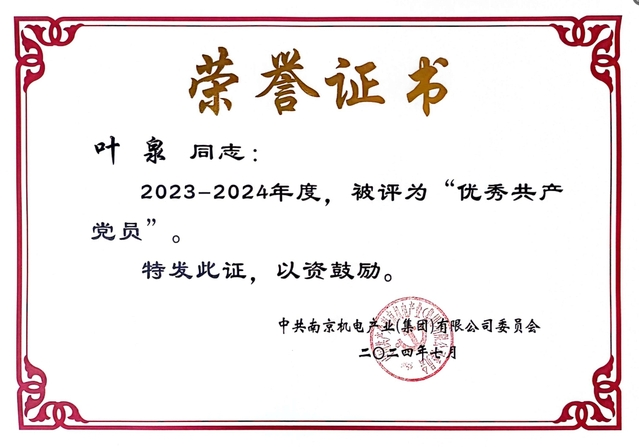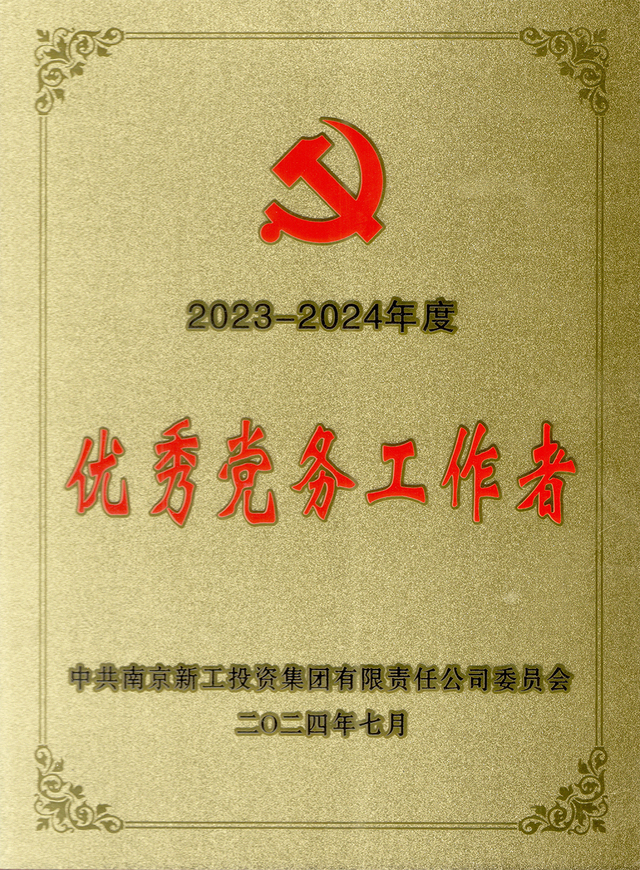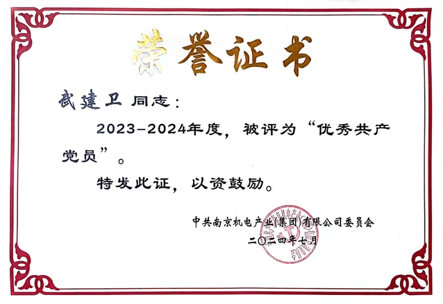 2024年7月,自动化工程系党支部被南京新工投资集团党委评为先进基层党组织。组织委员、组织员俞青被南京新工投资集团党委表彰为优秀党务工作者。叶泉、武建卫被南京机电产业(集团)党委表彰为优秀共产党员。