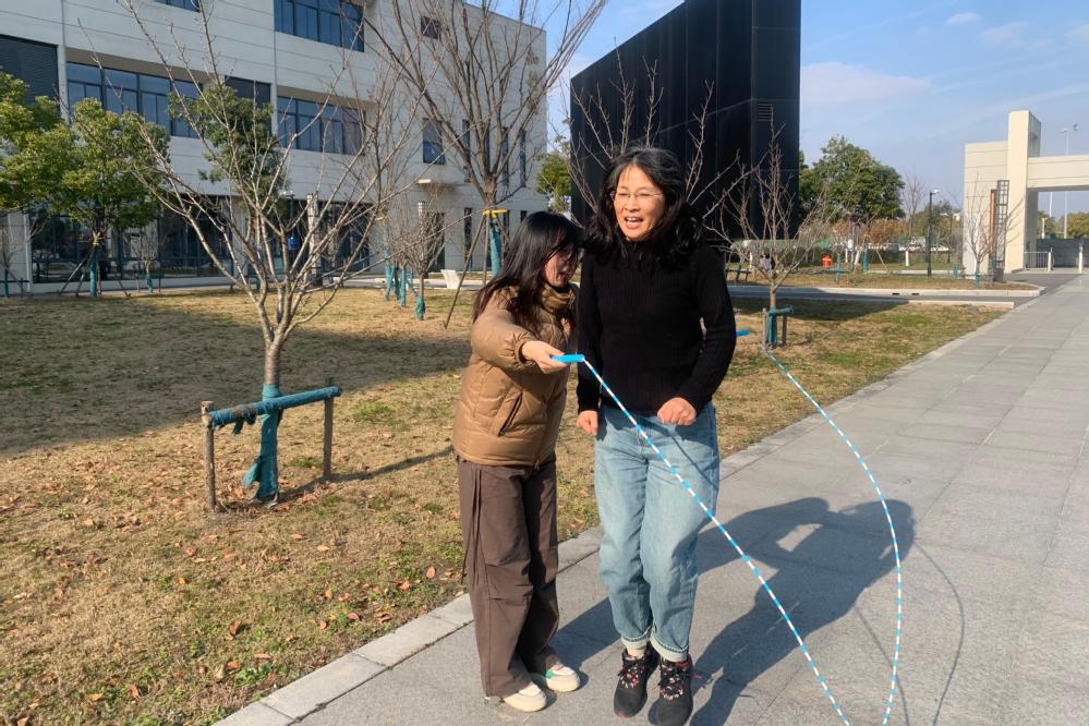 紧接着的双人跳绳项目,要求师生之间两两合作,共同完成一系列高难度、富有趣味性的跳绳动作。从最初的生疏到后来的默契配合,都伴随着现场观众的热烈掌声和欢呼声,同步的跳跃与甩绳动作尽显协作之美。在跳绳的翻飞中,不仅展现了高超的跳绳技巧,更传递了师生间相互尊重、共同进步的和谐氛围。