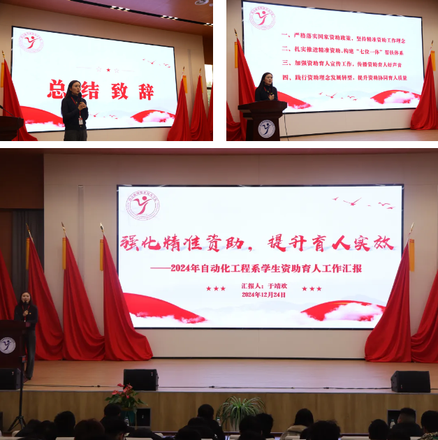 为深入学习贯彻党的二十届三中全会精神,深化关工委关爱助学工作,切实加强系部资助宣传大使团队建设,持续助力学生健康成长,教育引导青年学子立报国强国大志向、做挺膺担当奋斗者,12月24日,自动化工程系在乐学楼报告厅成功开展资助育人系列活动暨2024年度学生资助工作总结会。自动化工程系学工团队全体成员、学生干部代表和全体受助学生参与活动,活动由2024年国家励志奖学金获得者学生代表张建蓉主持。